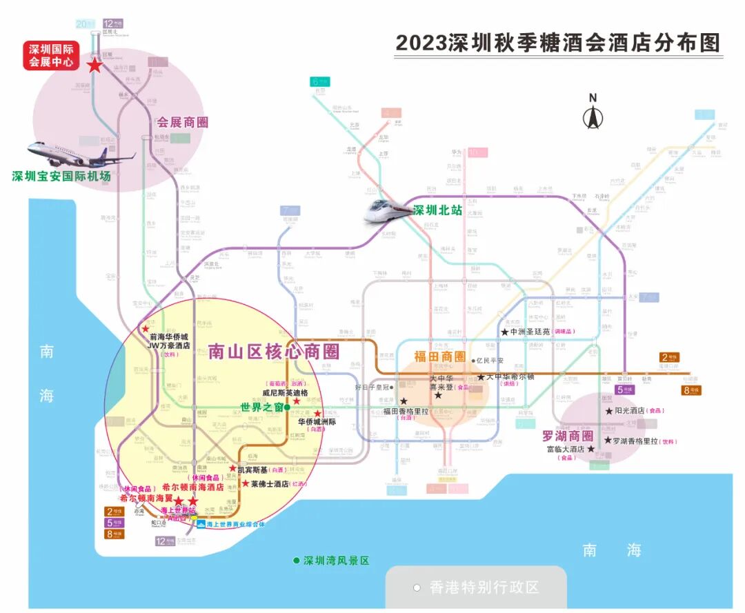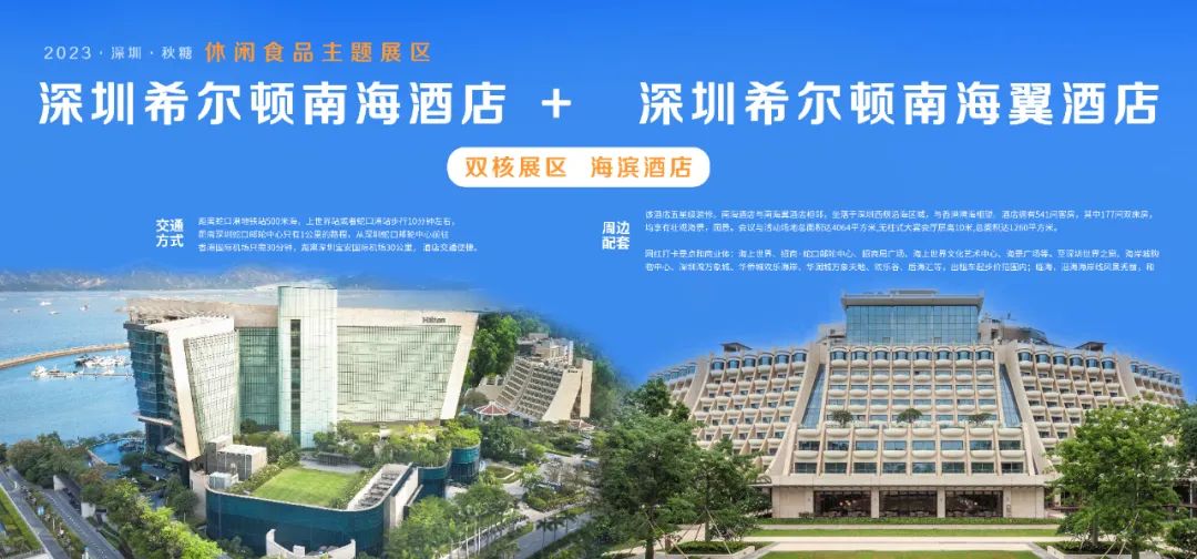 酒店展逛展攻略 同往届一样,酒店展按照食品、饮料、酒水、调味品等品类划分专区,通常相同品类专区的酒店聚集在一起,形成热点布展商圈,同时更方便经销商逛展。 Food Zone 简介:希尔顿南海酒店+希尔顿南海翼酒店,双核展区,海滨酒店,设展面积1000+㎡,322间展房,可容纳600+企业同时展出。 名企引领、大牌云集,客商精准引流。代表品牌:港荣、金丝猴、馋嘴猴、三只松鼠、徐福记、力诚、亲亲、一家人、休闲农场、港吧、帝膳堂、艾妍、怡浓、展翠、海玉、百诺、无疆、牧谣、凯涛奇、乐吧、东方快船、百年传奇、宏源、好利源、印味、金语、卧龙神厨、知味轩、金德福、好楂、吒老三、乐逍遥、云品鲜等 交通: 主题:食品饮料专区 地址:深圳市罗湖区和平路1085号 路线:地铁1号线罗湖站A3出口 Drinks Zone 主题:饮料展区 2023深圳秋糖品饮汇秋季饮品主题展将于10月07日—11日在深圳前海万豪酒店举办,由品饮汇&希姐甄选联合主办。品饮汇已陪伴超5000家饮料品牌发展成长,为10W+经销商提供选品服务。本次展会以“饮力驱动 4W链接”为主题,洞察“饮品消费趋势”,打造创新品牌&产品的舞台,并带来更好喝、更健康、更有趣的产品与体验。300+展商、2000+创新饮品将在这里共同亮相,涵盖了茶饮、咖啡、NFC果汁、气泡水、功能饮料、国货汽水、矿泉水、年货礼盒、植物饮9大品类的头部品牌、区域特色品牌及优秀的创新品牌,汇源、华洋、葡口、宝桑园、喜茶、蜜雪冰城、茶小开、好佳一、阿尔卑斯等年度最创新的饮品品牌代表们将汇聚在这里亮相发布,同期举办“2023中饮超级路演秀”“2023中国饮品创新发展峰会”“2023中国饮品经销商渠道增长赋能大会”“2023希姐甄选饮品研习社”“希姐甄选品牌体验馆”“品饮汇星推馆—直击秋糖探馆”《饮品有道》饮品家专访栏目等7大行业活动。我们相信通过这次“饮力驱动、4W链接”2023品饮汇秋季饮品主题展,会给全体与会嘉宾带来新的答案! Wine Zone Condiment Zone 第109届全国糖酒商品交易会 时间:2023年10月12~14日 展馆:深圳国际会展中心(宝安新馆) 路线:地铁12/20号线国展站或国展北站C1出口 据了解,深圳国际会展中心位于深圳市宝安区福海街道展城路1号,紧邻深圳机场,地处粤港澳大湾区湾顶、珠三角中心和广东自贸区中心,广深港核心发展走廊和东西向发展走廊的交会处,广佛肇、深莞惠和珠中江三大城市圈交会处,区位优势突出。 深圳国际会展中心项目一期占地面积121.42万平方米,一期总建筑面积达160万平方米,室内展览面积40万平方米,是集展览、会议、活动、餐饮、商业、服务于一体的超大型会展综合体! 本届糖酒会共设置了七大展区,包括: 休闲食品及烘焙:9号馆/11号馆 饮品及乳制品:10号馆/12号馆 葡萄酒及国际烈酒:2馆 调味品及配料:15号馆 传统酒类:14号馆/16号馆 包装及供应链/食品机械:17号馆 展区设置 专区设置 重磅活动 此次深圳秋糖,以下活动不容错过! 活动1:2023(第二届)中国量贩零食产业大会暨秋季糖酒会供应链品牌对接会 时间:10月8日 地点:坪山格兰云天大酒店 坪山区 活动2:2023第十七届中国食品产业成长之星颁奖盛典暨中国食业增长家论坛 时间:10月10日 地点:深圳深铁皇冠假日酒店 南山区 深圳游玩景点、购物中心推荐 南山区网红景点推荐:世界之窗、海上世界、欧洲印象、锦绣中华、欢乐谷华侨城创意园、南海意库、深圳野生动物园。 南山区购物中心推荐:海岸城购物中心、深圳湾万象城、华侨城等 出行指南 1、地铁 展会期间人群流量巨大,停车位“一位难求”,几乎所有布展酒店都禁止车辆通行,建议观展客商选择地铁出行,方便快捷。 2、自驾:选择自驾的商家朋友们,请注意深圳交通限行规则 限行车辆:禁止非深圳市核发机动车号牌载客汽车在全市道路通行,以下非深圳市核发机动车号牌载客汽车不受限行措施限制:执行任务的军车、警车、消防车、救护车、工程救险车;持道路运输证件的客运车辆(不含租赁小汽车)及中型以上客运车辆;香港号牌(含香港内地牌和内地香港牌)、使领馆号牌车辆。 限行时间:2023年工作日7:00-9:00,17:30-19:30 限行道路:全市道路,以下道路除外:S3广深沿江高速、G4广深高速、G15机荷高速、S33南光高速、S31龙大高速、G94梅观高速、S29清平高速、G4E盐排高速、S28水官高速、G4E博深高速、S30惠深沿海高速、G15深汕高速、G25长深高速、S86外环高速、东部过境高速、S3广深沿江高速、东滨隧道、东滨路、沙河西路、G4广深高速、皇岗路(皇岗口岸段)、百合路、同庆路、福田南路(皇岗口岸段)、G4广深高速、桂花路、国花路、裕亨路、S29清平高速、玉平大道、泥岗路(红岭立交至洪湖立交段)、洪湖西路、人民公园路、和平路、沿河南路辅道东行方向(人民南路至文锦南路段)、S29清平高速、玉平大道、泥岗路(红岭立交至洪湖立交段)、文锦北路、文锦中路、文锦南路、S30惠深沿海高速、G4E盐排高速、深盐路、沙盐路、沙深路、G25长深高速、东部过境高速、G4广深高速、G15机荷高速、机场南路、领航高架、空港八道。 注意事项:非深圳核发机动车号牌载客汽车前两次在深圳限行区域内违反限行规定的,不予处罚,自第三次违反限行规定起进行罚款处罚。 免限行申请:如果外地车在限行时段需进入限行路段,可提前申请,每月一次。 餐饮 特别提醒大家,酒店展期间